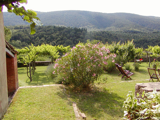 The estate buildings form a small complex with some farmhouses, the villa and agricultural buildings in a beautiful position on top of a hill, with extensive views of the surrounding countryside. Wide, sandy floored cypress lined avenues traverse the forested hills of the estate, often terminating in belvederes at the most impressive viewpoints. Through the tangled woodlands, across the cultivated plain below, one can see Siena and the Chianti hills in the distance, and there is a rare abundance of wild flowers and animals.