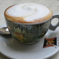 A true Italian cappuccino is made with 25ml (almost 1 oz.) espresso and 125ml(4+oz) frothed milk. A hundred millilitres of cold (3.5oz) fresh milk with at least 3.2% protein and 3.5% fat content must be frothed to 125ml, reaching a temperature of 55C. Note that water boils at 100C, so the milk is only to come half way to the boiling point. It then needs to be poured over 25ml certified Italian espresso in a white 160ml (5.5-6oz) cup. The end result should be “white with a brown border, and should have an intense aroma with hints of flowers and fruit under the stronger scents of milk, toast (cereals and caramel), chocolate (cocoa and vanilla) and dried fruit.”