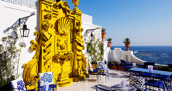 The bar gets it’s name from Franco Sersale, who was an art connoisseur whose impeccable taste did so much to define the signature style of Le Sirenuse. From the pearl-white tiled floor, hand-fired by an ancient Salerno ceramics firm, to the selection of Mediterranean plants, to designer slender, elegant, deep-blue garden tables and chairs in tubular steel, each new layer both complements and plays off against the others. Completing the design part of the equation are ‘Marie Antoinette’ lamps, intriguing by day and magical by night, Venetian designer fine string curtain made up of antique blue and white glass beads, and Murano tumblers with bold blue stripes. The bar’s logo, a blue sun or starburst with eight mermaid-tail rays, perfectly expresses the playful elegance of Positano’s new open-air salotto.
